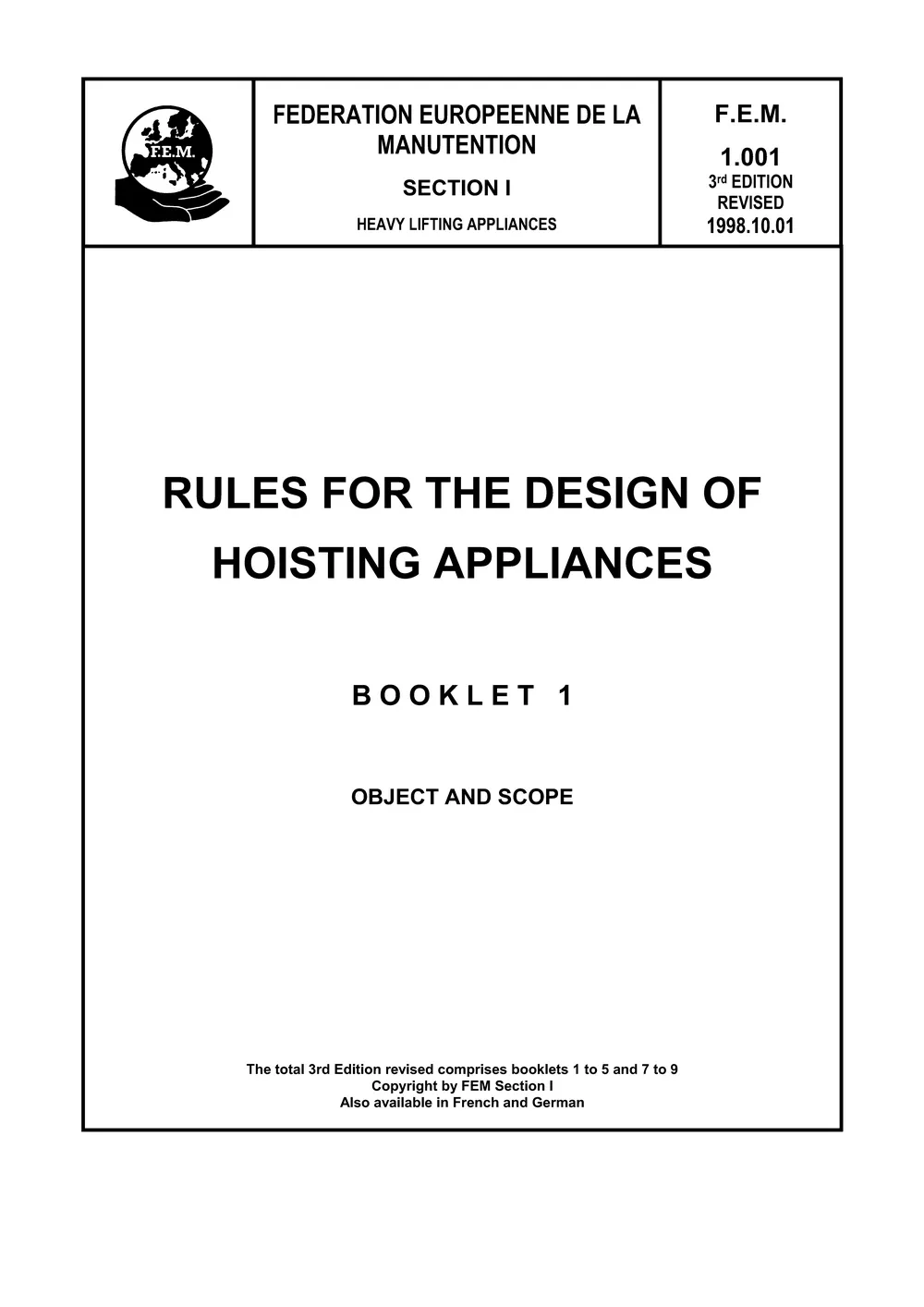 FEM 1.001 Rules für the Design of Hoisting Applianaces